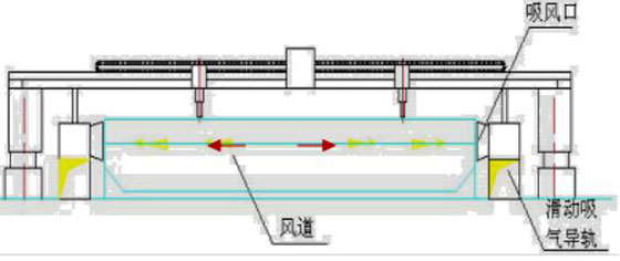 在切割平臺兩側安裝方形吸風道,吸風道上方裝有一個可隨切割機一起移動的滑動吸風小車(每個切割機兩個)。滑動吸風小車、切割頭、安裝在切割機沿橫梁方向的同一直線上。利用切割平臺上的格柵板與被切割鋼板形成煙氣通道,切割鋼板時,產生的切割煙塵通過該煙氣通道由風機負壓作用流向滑動小車吸風口,進入方形吸風道,最后進入凈化器主機進行切割煙塵凈化處理。