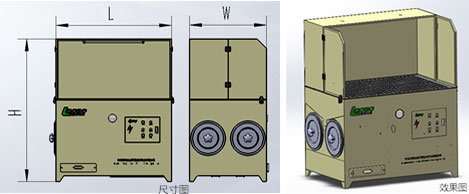 煙塵通過風機產生的負壓經工作臺面風口進入凈化器,氣流進入導流通道,大顆粒粉塵與導流板碰撞后,大顆粒粉塵在重力的作用下落入集灰抽屜,含細小顆粒的粉塵進入過濾室,含塵氣體由濾袋外表面穿過濾芯,粉塵則被濾芯阻攔在其表面,當被阻攔的粉塵在濾芯表面不斷沉積時,通過手動清灰機結構清掃濾芯,也可通過脈沖噴吹對濾筒清灰使得沉積在濾芯上的粉塵顆粒在振動的作用下脫離濾芯表面落入集灰抽屜中,使得整個濾芯表面都得到清掃,凈化后的空氣由風道、經風機排出。